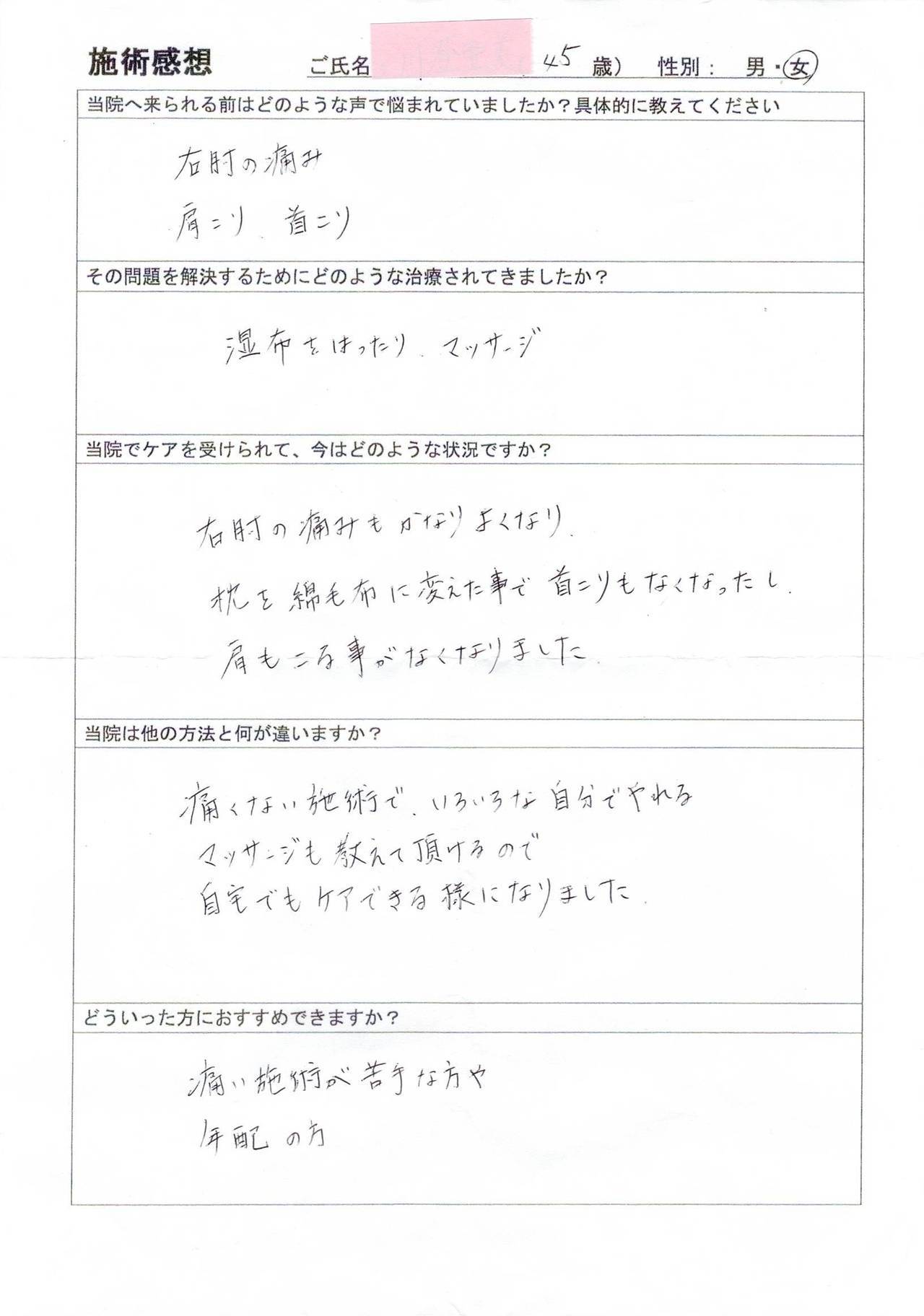 A.整形外科では診断した首しかリハビリできなのでまったく治らなかったが、整体では原因と考えられるところを全てケアしてもらえて、全く曲がらなかった首がスムーズに動くようになった。何年も使ったことのなかった枕が使えるようになった。足や身体全体の力も抜けて寝られるようになった。